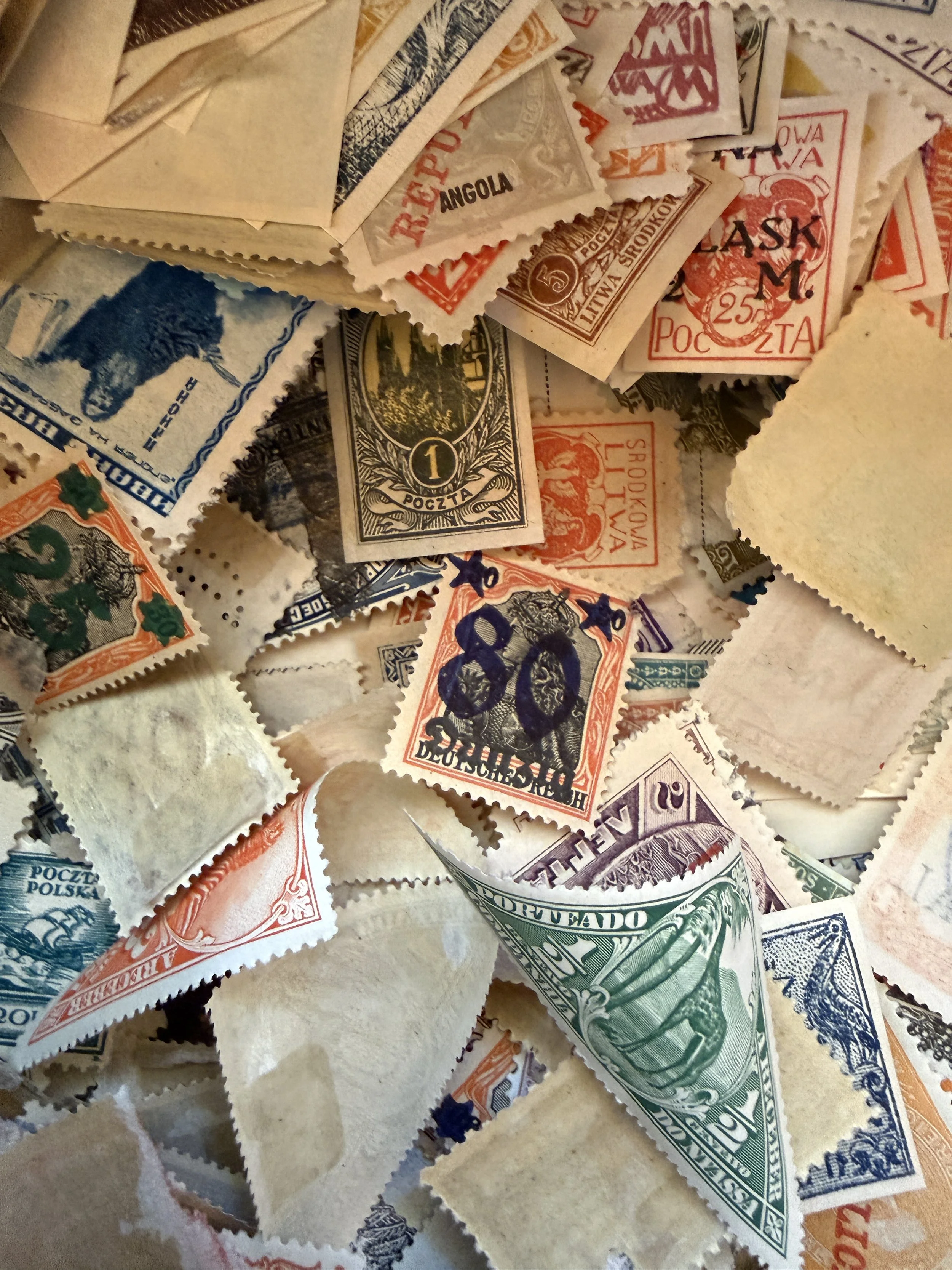 Stamps are so immediately recognizable that they become an overwhelming focal point in a composition. Envelopes need to be unfolded before use, because the existing adhesive can be difficult to work around and tends to cause bubbles. And with letters, I'm reluctant to use someone's writing directly — the topics are often deeply personal, and even if the writer died long ago, those secrets feel like they deserve some protection.