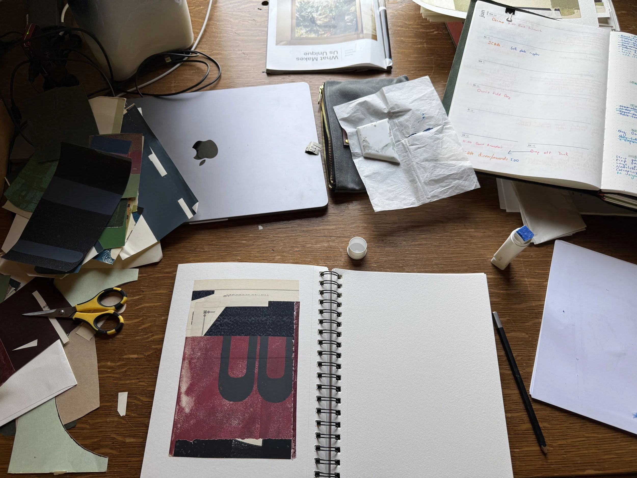 Each morning begins with a notebook session where I plan what I’ll work on for the day, adding new items and crossing off completed tasks throughout the day. I’ve tried a schedule where each day has a specific focus (business/studio), but that never works. I like the flexibility of choosing what to work on each day.